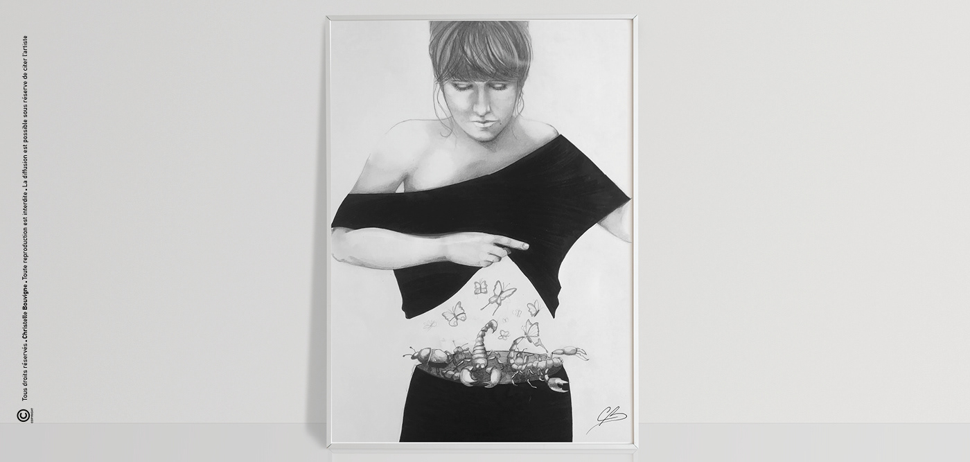 Le dessin, met en évidence la beauté mystérieuse des papillons "Ithomia salapia", à la fois transparents et toxiques, leur fragilité apparente cache leur potentiel destructeur. Les scarabées symbolisent les pièges et les conséquences destructrices auxquels on peut être exposé lorsqu'on se laisse emporter par des sentiments passionnés.